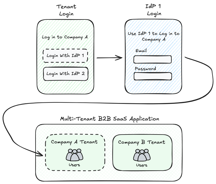 To enable SSO in a multi-tenant app, tenants must integrate with one or more IdPs using standard protocols like SAML or OIDC. For tenants with IdP integrations enabled, their login pages should allow users to select which IdP they want to use to authenticate. After choosing an IdP, the application will redirect to the IdP’s login flow to complete the authentication process. Once the user successfully authenticates, the IdP will redirect the user back to the application.